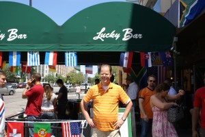 En daar zit ik dan, op een vrijdagmorgen, in de “Lucky Bar” (dank voor de tip!) in hartje Washington, een “American Breakfast” te eten, terwijl ik onderwijl naar Nederland-Brazilië kijk. Stel je het beeld voor:  een bar, met 25 televisieschermen, waar het druk is, waar de sfeer er behoorlijk inzit en ik – in m’n duidelijk oranje T-shirt – m’n toast, bacon en gebakken aardappeltjes zit te eten. Het lukt inderdaad nog om te zitten, men is hier vriendelijk. Er zijn nogal wat Oranje-fans, ik heb de indruk Nederlandse en Amerikaanse studenten en scholieren. Dus bij de 1-1 en al helemaal bij de  1-2 wisselen we veel ‘high-fives’ uit. Een oudere man staat naast me de wedstrijd te analyseren. “It’s a match that finally lived up to the hype”, zo vat hij samen dat Nederland eindelijk aan de verwachtingen heeft voldaan. En de foto is gemaakt door een kerel in een Braziliaans T-shirt. Sportief!